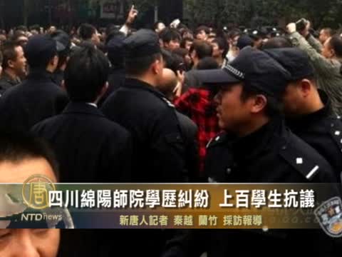 【新唐人2011年11月5日訊】四川綿陽市臨園路上,11月4號出現上百名綿陽師範學院的學生打橫幅遊行示威,他們抗議領到的畢業證書上記載的學歷有問題。官方出動了特警驅趕學生,有學生遭強行架上車帶走。