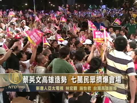 5號晚間民進黨總統參選人蔡英文,在高雄市成立競選總部,大批民眾將現場擠到水洩不通,看到蔡英文現身,支持群眾的熱情,讓蔡英文光是要走到臺上就花上十幾分鐘,讓她深深感受到高雄民眾的熱情。