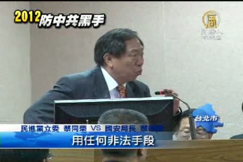 【新唐人亞太台2011年11月7日訊】新聞頭條,先帶您鎖定:台灣2012大選的選情緊繃,而對岸的中共,更是小動作頻頻,立委蔡同榮今天(7日)對國安局長蔡得勝質詢時問,如果中共企圖干擾台灣選情,派出黑手到造勢活動鬧場,官員究竟有沒有做好準備,對此,蔡得勝承諾,國安單位會全力以赴,並說有能力防止相關情況發生。