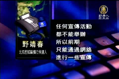 北京西城區獨立侯選人 野靖春:「任何宣傳活動都不能舉辦,所以前期只能通過網絡進行一些宣傳,那麼現在連網絡也給我們封死了,封殺了。」