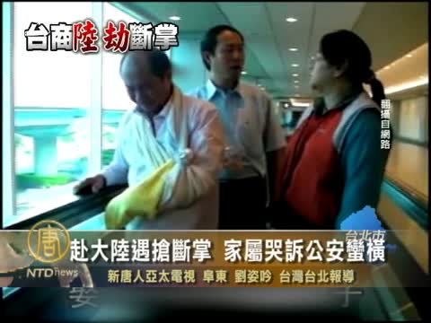 【新唐人2011年11月9日訊】一名胡姓台灣男子赴大陸福建探親,遭到歹徒搶劫並被砍斷手掌。而隨後公安處理態度,卻讓當事人與家屬再次受到傷害。家屬哭訴案件處理過程,公安態度不僅蠻橫,甚至還強行扣押男子的斷掌,不讓他們帶回台灣,而且過程中海基會也沒有積極協助。