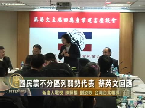 民進黨總統參選人蔡英文:「長時間以來我們從來沒有看過國民黨不分區名單,裡面有很多弱勢族群或者弱勢團體代表,那這一次有這樣的作法我們當然給予一定程度的肯定,不過我們民進黨長期以來,不分區名單都有弱勢團體的代表。」