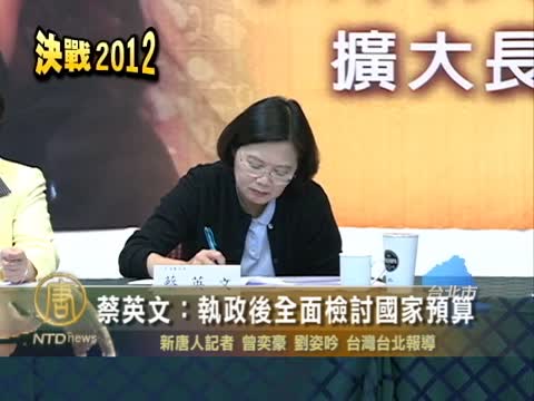 民進黨總統參選人蔡英文:「當我們1月14號結束選舉以後,我們會把所有的今年編的預算再重新檢討一遍,也就是說我們民進黨的執政優先順序跟國民黨有些是不一樣的,所以我們會把整個明年的預算再調一遍。」