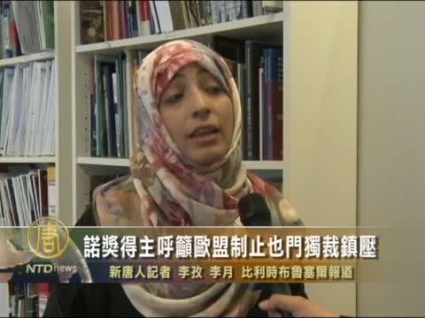 【新唐人2011年12月5日訊】今年諾貝爾和平獎得主之一,也門人權活動人士瓦庫•卡曼女士,在布魯塞爾揭露了新近在也門塔伊茲市發生的對和平示威民眾的鎮壓。她要求歐盟和國際社會立即採取行動,制止也門獨裁政權對民眾的鎮壓,不要受簽署下臺的同意書的矇蔽。