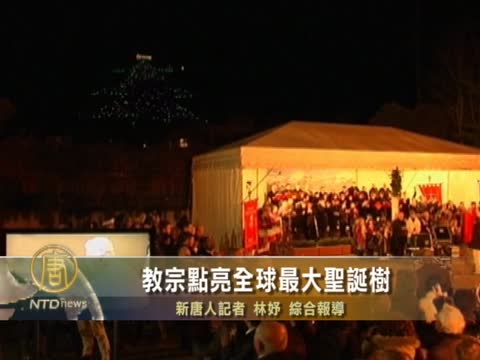【新唐人2011年12月8日訊】教宗點亮全球最大聖誕樹星期三(12月7日),天主教皇本篤十六世(Pope Benedict XVI)在梵蒂岡使用高科技,點亮位於義大利小鎮古比奧的「全世界最大的聖誕樹」,使這座小鎮在夜空下也成為了閃耀的一顆星。