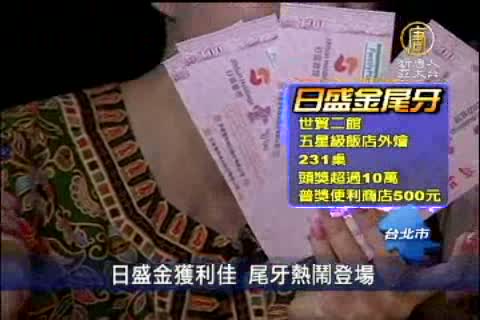 【新唐人亞太台2011年12月25日訊】金融圈的第一場尾牙由日盛金控率先登場。在世貿二館辦外燴,席開231桌,頭獎超過了10萬元,由於今年表現優於預期,董事長黃錦瑭也當場宣布,年終3.5~4個月,比起去年2個月,多出了將近一倍。