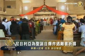 【新唐人2011年12月27日訊】星期一(12月26號),尼日利亞人在首都阿布賈外城鎮馬達拉(Madala)的一間教堂,為在頭一天爆炸案中的遇難者祈禱。