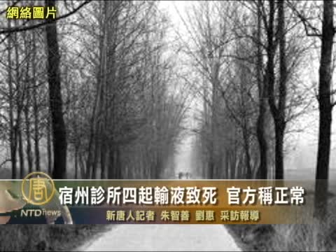 【新唐人2011年12月29日訊】近日,有村民反映, 安徽宿州毛莊衛生室一年半時間內,就有4人因輸液死亡。這家證照俱全的正規診所,連續發生多起醫療事故卻無人過問。當地主管機構防保所的負責人則稱,「進了醫院,有活就有死,很正常」。