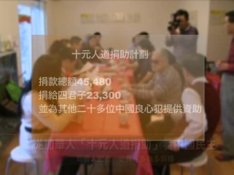 【新唐人2012年1月4日訊】2004年聖誕節,得知研究中國社會問題尤其是農村問題的「青年學會四君子」在中國大陸被判刑,加拿大的一群華人啓動了每月為他們捐款十加元的人道捐助計劃.2011年四君子全部出獄,但是捐款者都表示這份對中國良心犯和受難者家屬的支持不會停止。