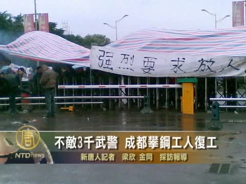 【新唐人2012年1月7日訊】四川國有企業攀鋼集團成都鋼釩廠的數千工人,要求漲工資連續3天罷工後,7號工廠恢復開工。工廠員工向本臺記者表示,他們的抗議在6號遭到武警強制鎮壓,一些工人被打昏後抓走。職工無法跟當局對抗,只好恢復開工。