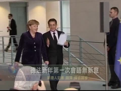 【新唐人2012年1月10日訊】德國總理默克爾(Angela Merkel)和法國總統薩爾科齊( Nicolas Sarkozy)去年為解決歐元區危機頻頻見面。1月9日是他們在新年以後的第一次會晤,仍然是要解決歐元區的危機及失業問題。