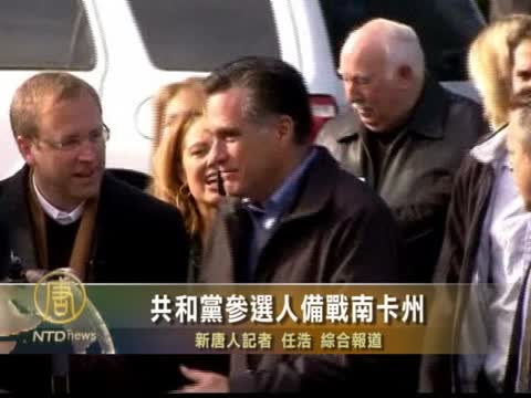 【新唐人2012年1月12日訊】在愛荷華州和新罕布希爾州初選結束後,各共和黨參選人根據自己的戰況,結合在南卡羅來納州的民調和選情,正在積極調整,爭取在21號的初選中取得一個好成績,因為南卡州的成績,對決定這次能否成為候選人具有重要的意義。