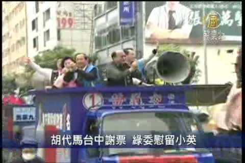 【新唐人亞太台2012年1月15日訊】馬英九總統連任成功,國民黨在中部地區,除了雲林縣輸了近5萬票外,其它縣市都開出紅盤,台中市長胡志強15日一早替馬吳進行謝時表示,大台中這次贏了超過10萬票的確有點意外,另外綠營中部幾位立委當選人,也立刻展開謝票行程,而他們同樣都對要辭職黨主席以示負責的蔡英文給予高度肯定,希望黨慰留小英。