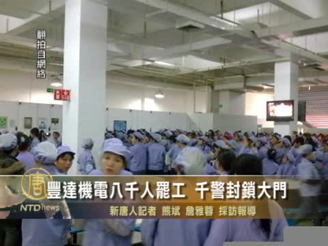 【新唐人2012年1月17日訊】廣西南寧日資豐達機電公司,週一爆發8000工人大罷工,抗議年終獎只發給管理階層,忽視了基層員工,加上家在外省市的遠地員工認為,過年假期7天太短,只能在車上過年,因而爆發不滿,政府出動上千警察到場封鎖大門戒備。