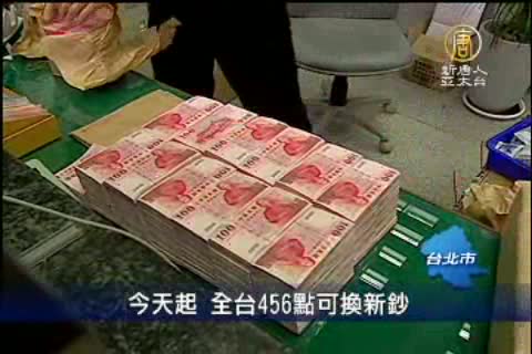 民眾搶換新鈔,銀行行員忙著拿出一疊一疊的錢磚來應戰,即日起到1月20日為止,包括臺銀、土銀、合庫等七家行庫,以及郵局,全國一共456個據點,全面開放兌換新鈔。其中最喜氣的紅色百元紙鈔,最受民眾歡迎。