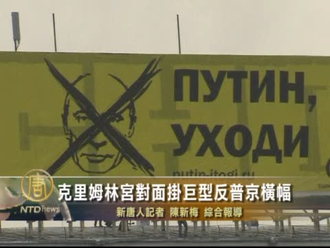【新唐人2012年2月1日訊】俄羅斯反對派活動人士,星期三(2月1日)在克里姆林宮對面建築物上懸掛巨型橫幅,呼籲總理普京下臺。
