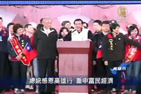 中華民國總統 馬英九:「我們內閣團隊也準備好了,一定要打造富民經濟,以安心內閣來自我期許,未來幾年把高雄打造成自由經濟的示範區。」