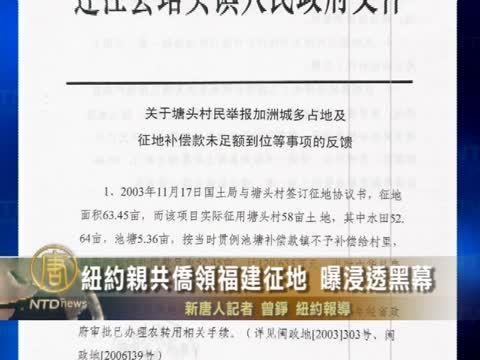 來自福建塘頭鄉的村民帶著厚厚的文件到本臺投訴家鄉200多畝農田被強徵,官方文件顯示,強徵土地的開發商包括紐約福建公所前任主席鄭明敏的華星房地產公司,以及股東之一為紐約珠城酒樓的雲南三鑫集團等。