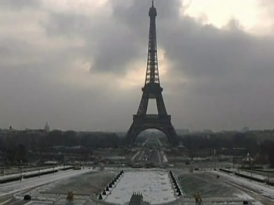 In Paris, the Eiffel tower stands tall over snow covered streets.