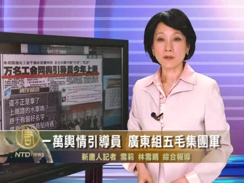 【新唐人2012年2月23日訊】近日,中共廣東省副書記朱明國在一個大會上宣佈,廣東今年要組建一萬名網絡輿情引導員、一萬名工資集體協商指導員、一萬名勞資矛盾調解員隊伍,還要組織一萬名工會幹部下基層進企業。其中,這一萬名“網絡輿情引導員”引發了網絡熱議。