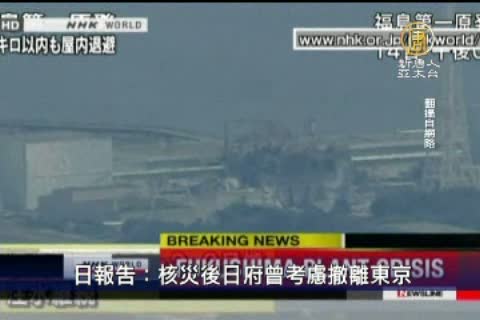 【新唐人亞太台2012年3月1日訊】日本311大地震即將滿一周年,日本一個民間基金會在2月28日公布 一份獨立調查報告,指出 在去年311大地震 福島核電廠發生事故時,日本政府內部和專家們,其實已經在探討最壞的情況,考慮放棄東京和進行大規模疏散的可能。