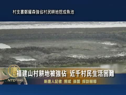 【新唐人2012年3月8日訊】中國福建漳州市詔安縣梅州鄉梅山村全體村民最近在網上舉報,村支部書記鄭耀森強佔全村近千畝耕地養魚,並僱用黑社會打手欺壓村民,近千人口失去生活來源,村民向上級政府反映無效,呼籲外界關注。