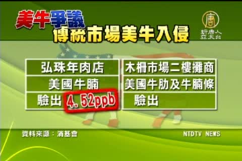 【新唐人亞太台2012年3月8日訊】美牛爭議再度考驗消費者對政府把關食品安全的信心。 消基會抽驗市售15件樣品中發現,有6件檢驗出萊克多巴胺,其中4件超過1ppb以上含量並產自美國,2件來自台灣的傳統市場,並指出,各地方政府衛生局都是抽驗大賣場與超市,現在連傳統市場也驗出牛肉含有萊克多巴胺,顯示問題相當嚴重,讓飽受質疑的「三管五卡」成效,再一次蒙上污點。