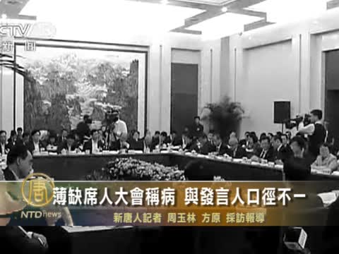 【新唐人2012年3月9日訊】重慶市委書記薄熙來缺席3月8號上午的人大代表會議引發關注。重慶發言人3月8號向外界表示,薄熙來身體絕對沒有問題。不過在3月9號的重慶團記者招待會上,薄熙來宣稱,他缺席的原因是身體不適。