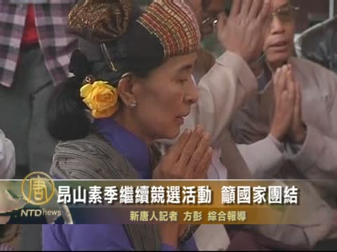 【新唐人2012年3月19日訊】緬甸議會4月份將舉行補選,民主運動領導人、「全國民主聯盟黨」(National League for Democracy Party﹔NLD)領袖昂山素季三月十八日(星期日)在撣邦北部的登尼(Theinni)展開競選活動,呼籲人們為了國家而團結。