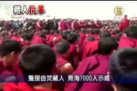 【新唐人亞太台2012年3月19日訊】接著來關心,為了聲援自焚的藏人,中國青海,爆發七千人抗議示威大遊行,這是當地三天來第二起大規模聲援自焚藏人的群眾事件。上個星期六,青海省藏人農民索南塔傑,引火自焚後,同一天,就引發青海多達七千名藏人的集會遊行。根據「自由西藏組織」表示,七千名藏人,原本參加索南塔傑的葬禮及火葬儀式,後來演變成示威遊行,部分民眾還遊行到市中心訴求自由。有不具名的目擊者表示:這是他看過最大規模的集會。