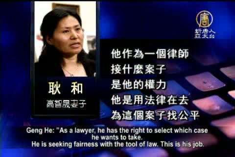 【新唐人亞太台2012年5月25日訊】在剛剛的新聞中,提到了大陸著名維權律師高智晟,接下來,我們繼續帶您看到,他的妻子耿和,發表了給高智晟的第三封公開信。信中,耿和傾訴了對高智晟的擔憂和思念之情。同時她也指出,高智晟被非法迫害以及造成他們家庭的骨肉分離,背後的黑手就是中共政法委系統。她還表示,陳光誠爭取自由的成功,給了她希望和鼓舞,為了高智晟的自由,她不會放棄。她在接受本台記者採訪時說,希望大陸的同胞給予高智晟安慰和支持,聲援高智晟。