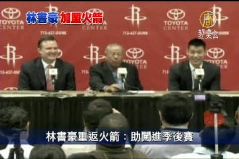 【新唐人亞太台2012年7月20日訊】來關心NBA台裔球星林書豪的最新動向。休士頓火箭隊擺出大陣仗記者會歡迎林書豪,近100家媒體參與。林書豪在這項加盟記者會上強調,他會盡其所能,帶領火箭隊闖進季後賽。