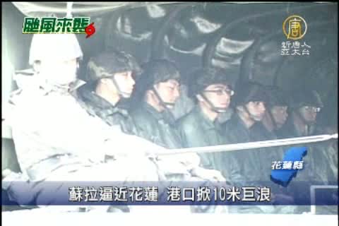 【新唐人亞太台2012年8月1日訊】風雨逼近,花蓮港上午已經掀起罕見的10公尺浪花,花蓮萬榮鄉的見晴村在國軍官兵的協助下,昨天夜裡到今天凌晨開始進行預防性撤村,協助居民前往活動中心,隨著東部地區風雨增強,蘇花公路臺9線蘇澳至崇德路段,下午兩點起全線封閉。