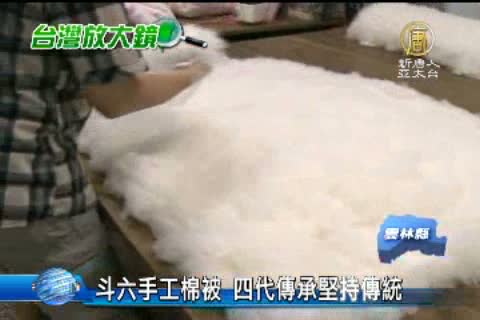 【新唐人亞太台2012年10月30日訊】天氣轉涼,這時候就需要一床暖呼呼的棉被才能一夜好眠。傳統手工棉被越來越式微。不過,在斗六一家手工棉被行,已經傳到第四代,仍繼續做著手工棉被,堅持天然,不用化學纖維,老雇客至今仍大有人在。儘管很多同業為了經濟省力,都轉向工廠批貨,但業者仍堅持傳統的價值,希望能傳承下去。