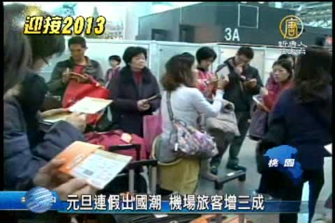 【新唐人亞太台2012年12月29日訊】繼續帶您看到 ,一連4天的元旦連續假期,像提早過年,有不少人計畫出國度假, 今天(29日)桃園機場出現大量的人潮,單日統計高達4萬7千多人,出境人數比平常多了3成,讓機場人員是忙得不可開交。