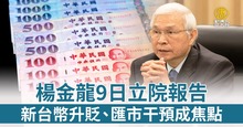 楊金龍9日立院報告 新台幣升貶、匯市干預成焦點