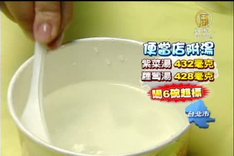 如果加上豬肉沾醬吃,鈉更多,一鍋就逼近3000毫克,冬天銷路很好的關東煮,麻辣口味,鹽巴下手也很重,200毫升,就有1062毫克的鈉,喝兩碗,就超標。便當店,免費附贈的蛋花湯、蘿蔔湯,一小碗就400毫克的鈉。