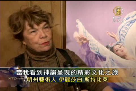 明州藝術人 伊麗莎白‧斯特比萊(Elisabeth Steblay, Retired Musician and Dancer):「我喜歡!我非常喜歡!我非常高興再次觀賞神韻,五年前我看過。他們所做的讓我非常震撼,現在他們已有三個團了?!對不對?還在全球巡演?!天啊,太棒了,太棒了!我們到過中國,我喜歡那裏的文化,喜歡中國,我無法形容有多麽地震撼,當我看到神韻呈現的精彩文化之旅,同時告訴我們正在發生什麽。」