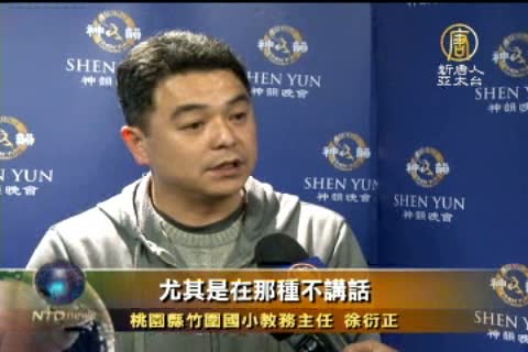 【新唐人亞太台2013年3月28日訊】美國神韻巡迴藝術團27日下午在桃園展演中心進行首場演出,一同前來觀賞的桃園縣竹圍國小校長和教務主任,對神韻以天衣無縫、完美精緻的藝術型式詮釋中華五千年傳統文化的精華,讚賞不已。
