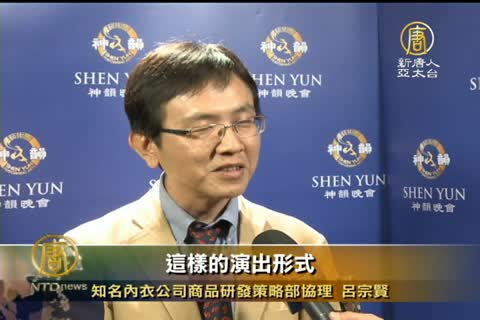 【新唐人亞太台2013年4月1日訊】美國神韻巡迴藝術團3月27日晚上在桃園的第三場演出,第一次看神韻的內衣知名公司商品研發策略部協理呂宗賢表示:能看到讓人沈澱的靜心的神韻演出,是非常大的福氣。