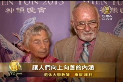 【新唐人亞太台2013年5月1日訊】美國神韻國際藝術團在佛州西棕櫚灘(4/29)的首場演出,給敬老院牧師及大學教師庫利夫婦留下了深刻印象。他們感歎神韻充滿了寧靜、平和、慈悲和關愛,是一種精神境界的體驗。