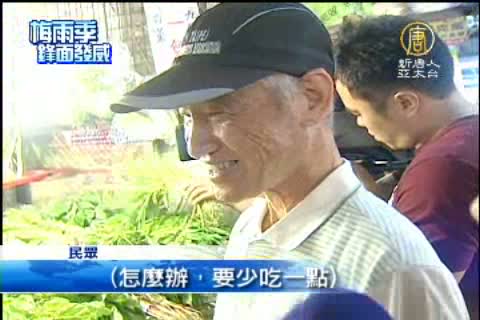 【新唐人亞太台2013年5月20日訊】連日大雨,蔬菜產地損失慘重,一走進菜市場,不但發現葉菜類,被雨水打得賣相不佳,價格更是水漲船高,高麗菜一顆漲了快2倍,地瓜葉漲了5元,青江菜貴了7成5,絲瓜、苦瓜也漲得兇,讓不少菜籃族抱怨連連。