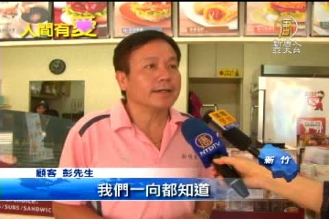 【新唐人亞太台2013年6月19日訊】吃早餐還可以做愛心,竹東高中附近有一家知名早餐加盟店,捐出一日所得幫助貧童,還結合台灣世界展望會「愛的麵包撲滿」認捐活動,在6月21日(週五)前,民眾只要捐款兩百元,就可將存錢筒帶回家,早餐店還贈送大杯紅茶。