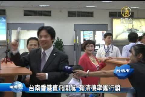 【新唐人亞太台2013年7月18日訊】台南、香港直飛班機今天(18號)下午啟航,台南市長賴清德等人順利取得港簽,率團赴港進行城市行銷。今後這條航線每週二、四跟星期天,都將有定期班機直飛香港,為南台灣開啟了第二扇國際大門。