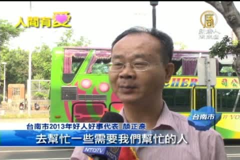 【新唐人亞太台2013年9月16日訊】台南12位來自各階層的好人好事代表,因樂善好施而接受表揚,一位顏正彥先生,長期默默協助身心障礙者,帶著他們參加社區中秋節活動,期望藉與社會接觸建 立信心,還有黃界仁先生,30年來在捐血中心當義工,出錢出力默默付出,鼓勵民眾捐血,希望推動做好事,把社會引導向善的一面。