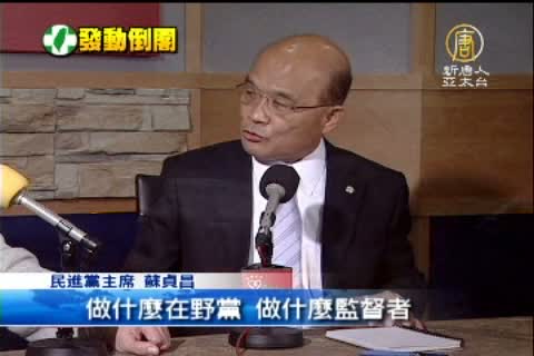 【新唐人亞太台2013年10月14日訊】立法院明天(15日)就要針對倒閣案,進行全院表決,民進黨主席蘇貞昌則是展開媒體攻勢,今天(14日)一早接受電台專訪,重申倒閣決心,認為即使力不如人,但道理絕對站得住腳,面對外界一致認為倒閣成功機率近乎為零,蘇貞昌也提出自己的看法。