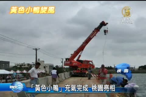 黃色小鴨26號即將要在桃園的後湖塘登場,今早趁著風勢稍減,主辦單位順利的將黃色小鴨組裝充氣,小鴨在桃園首度和民眾見面。