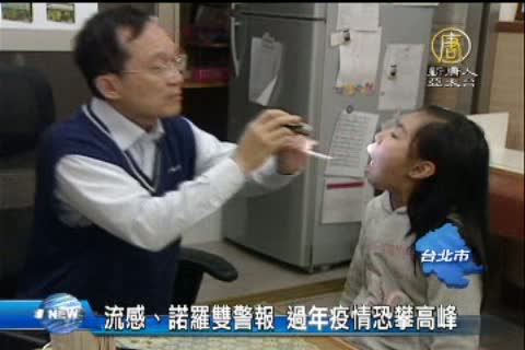【新唐人亞太台2014年1月15日訊】國內流感、諾羅疫情,雙雙拉警報,疾病管制署公布,上週流感就醫人數,突破10萬人次,比去年同期增加近 一半,腹瀉就醫人次,也上看17萬4,239人次,就連東亞地區,也有諾羅、腸病毒、H7N9等疫情,醫師警告,過年期間,將是疫情高峰期,不管在國內或 出國,民眾都要小心。