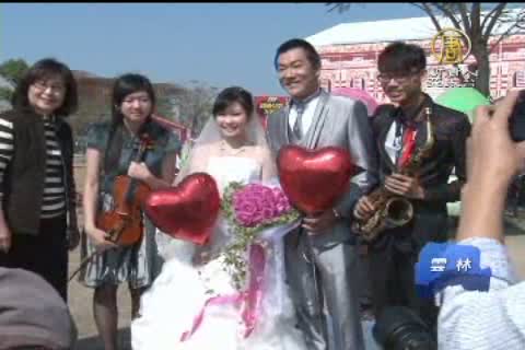 【新唐人亞太台2014年1月28日訊】去年底在雲林盛大開幕的農博,為雲林帶來不少熱鬧氣氛,農博的園區也對外開放,提供給新人免費入園拍婚紗,日前,一位任教職的準新郎,特別選擇學生參觀農博的日子,入園拍婚紗,雲林縣長蘇治芬還特別到場祝福。