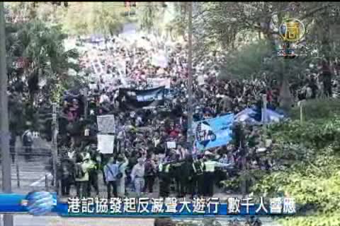 【新唐人亞太台2014年2月23日訊】香港記者協會今天發起「企硬反滅聲,撐言論自由」大遊行,多個團體響應,捍衛新聞自由,記協表示有超過六千人參與,從中環遮打花園集合出發,下午2時30分開始遊行前往梁振英的辦公大樓。香港最近發生多起,包括明報更換總編輯及香港商業電台解僱李慧玲等,新聞自由受打壓的事件,受到國際關注,香港泛民主派政黨、獨立媒體大紀元時報等多團體都熱烈響應,到場參與這次反滅聲遊行。